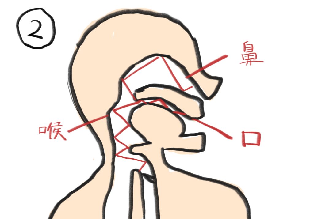 ②声帯が振動してできた音が喉、鼻、口で響きます。