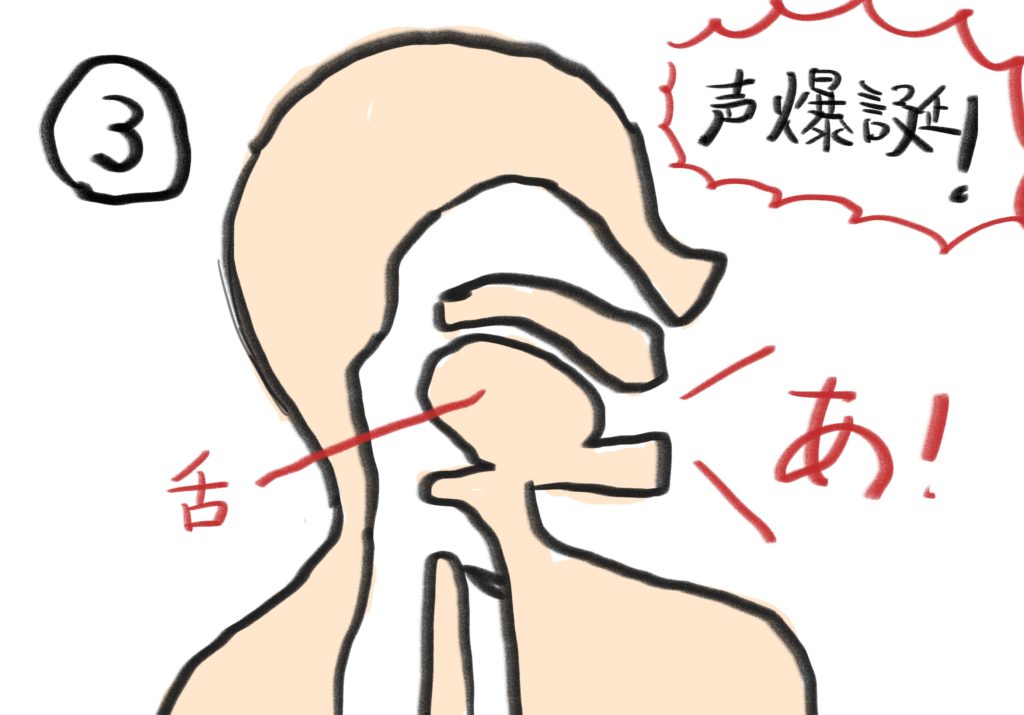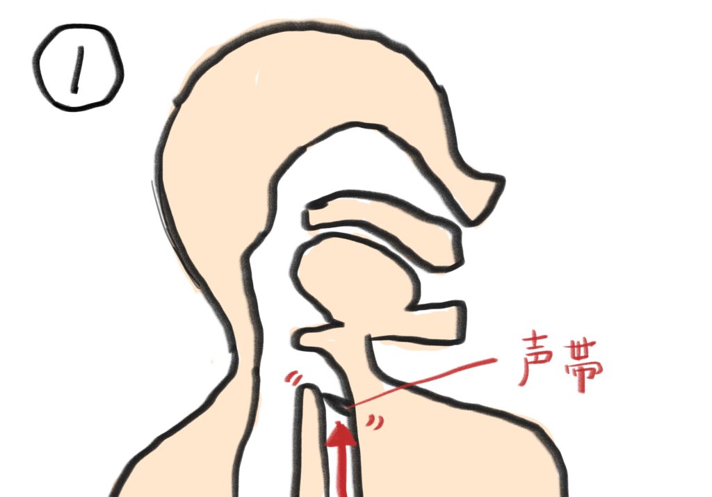①肺から空気を送り、声帯を振動させます(声帯が振動する仕組みについてはのちに説明します)。